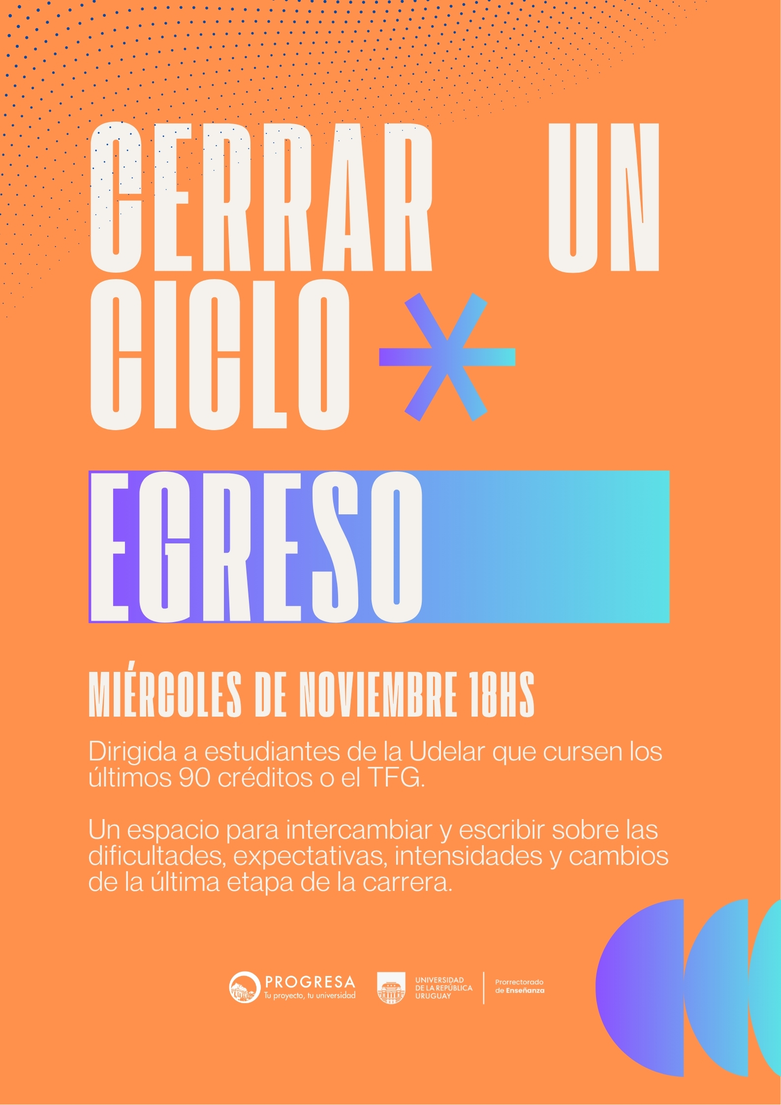 El ciclo “Cerrar un ciclo: acompañamiento al egreso” consta de cuatro talleres donde se trabajará sobre las dificultades, expectativas, intensidades y transformaciones propias del cierre de la formación universitaria. A través de la escritura y el intercambio, se propone generar un espacio de encuentro para compartir experiencias, información y estrategias que faciliten este proceso.
