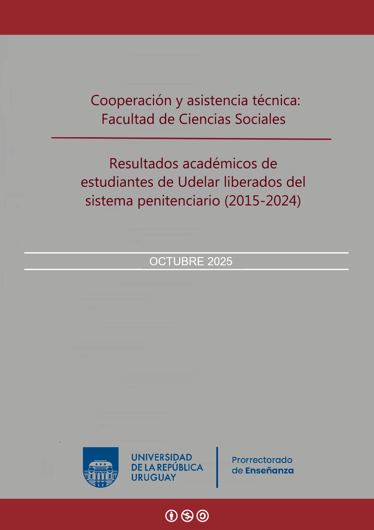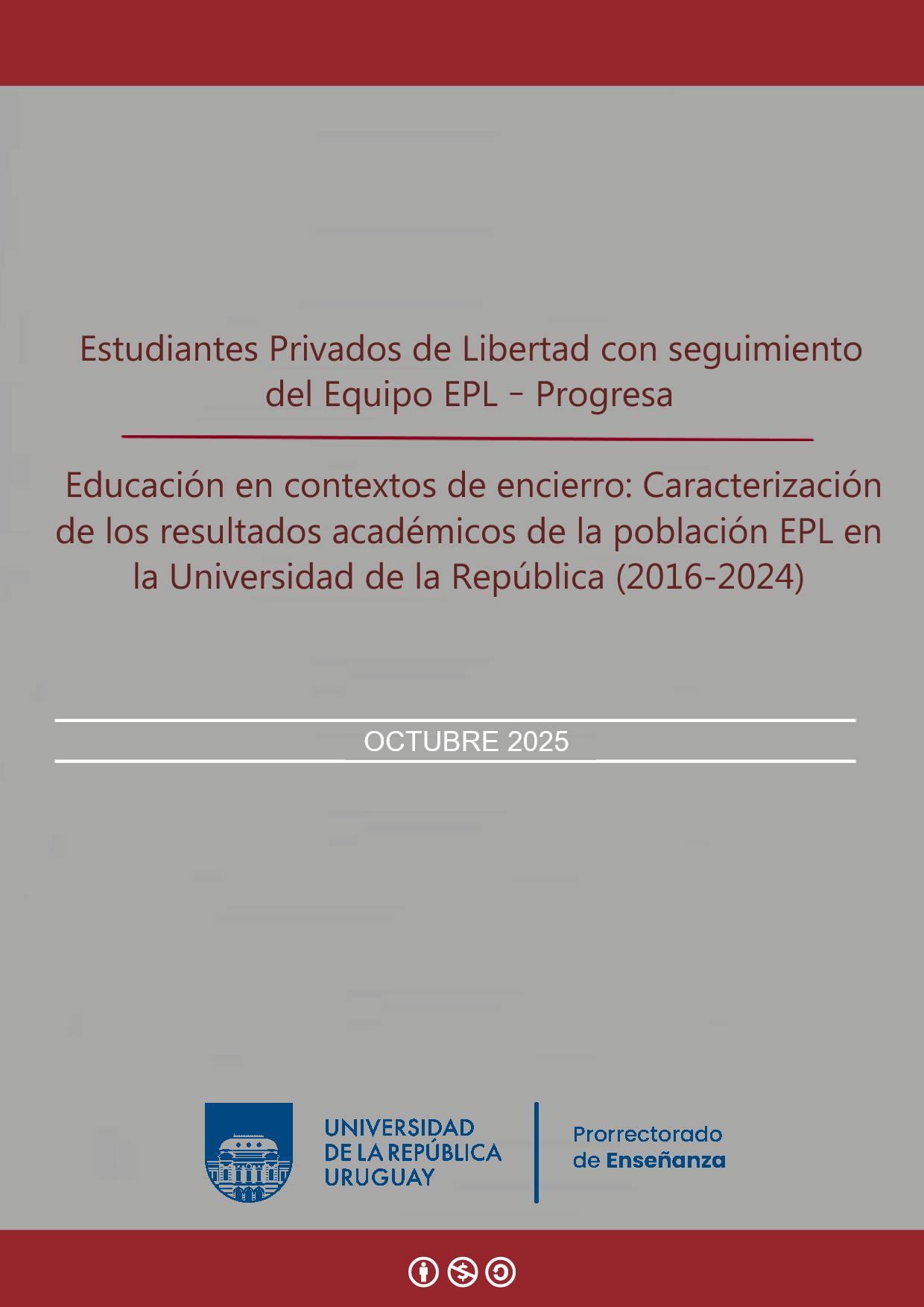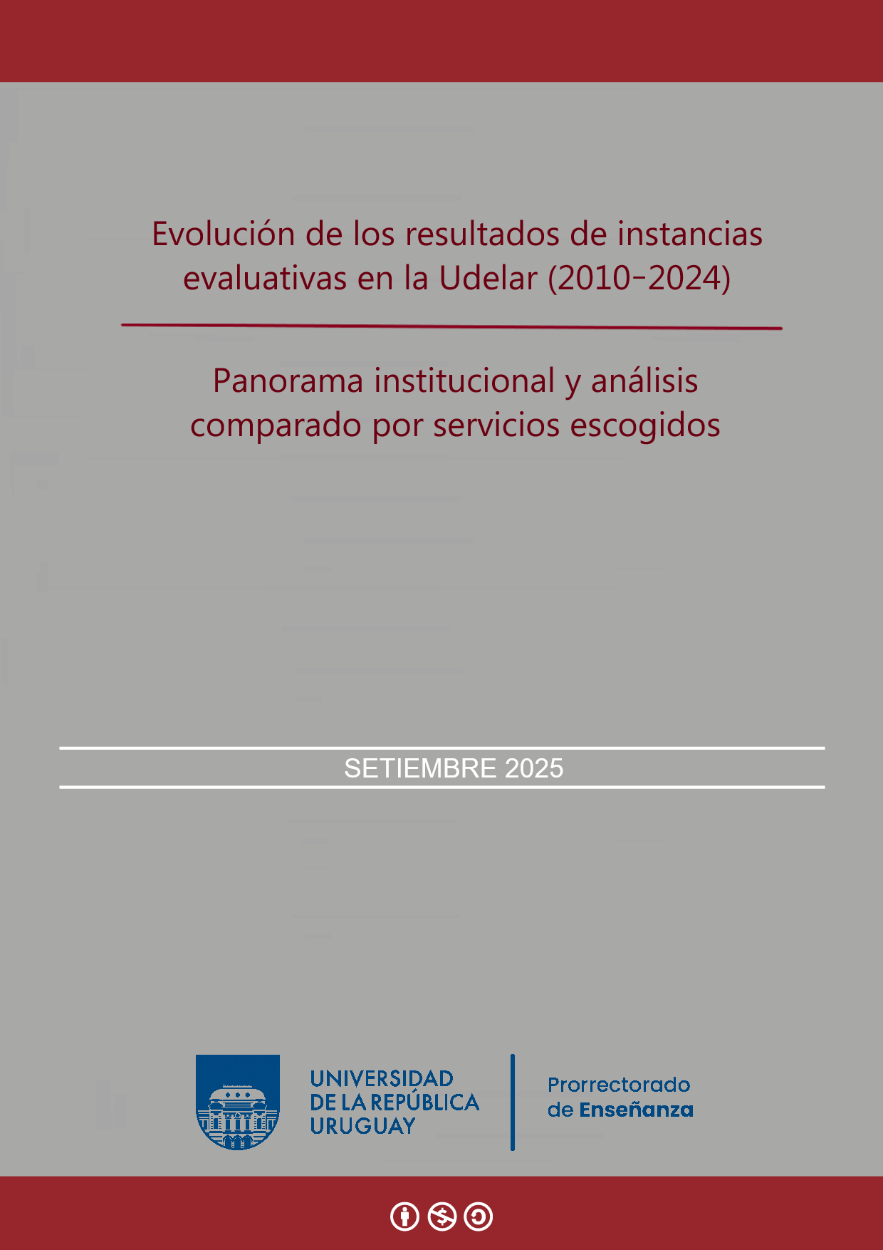 Antecedentes y Normativa de los Sistemas de Información en la Educación Superior en UruguayAntecedentes y Normativa de los Sistemas de Información en la Educación Superior en UruguayLeandro Pereira y Emiliano ClavijoAño 2025Documento que analiza el marco normativo y el funcionamiento del sistema educativo nacional en Uruguay, enfocándose en la producción de estadísticas y los actores clave responsables de su generación en el ámbito de la educación superior. Caracterización general de trayectorias Udelar: Ingresos, permanencia y egresos. Período 2010-2022. Sistema de Información de la Enseñanza 2025 (SIE-CSEEP)Caracterización general de trayectorias Udelar: Ingresos, permanencia y egresos. Período 2010-2022Gabriel ErrandoneaAño 2025Revista Sistema de Información de la Enseñanza 2025 (SIE-CSEEP) El documento, con base en indicadores que son el resultado de la integración conceptual de fuentes a partir de la definición de problemas, pone a disposición de autoridades, investigadores, docentes y estudiantes una primera serie de datos significativos que permiten analizar la evolución de la enseñanza de grado en la Udelar. La iniciativa busca convertirse en una herramienta clave para comprender y evaluar las transformaciones y desafíos en la formación universitaria, contribuyendo a la toma de decisiones fundamentadas y al diseño de estrategias educativas más inclusivas y eficaces. Educación en contextos de encierro: Caracterización de los resultados académicos de la población EPL en la Universidad de la República (2016-2024)Educación en contextos de encierro: Caracterización de los resultados académicos de la población EPL en la Universidad de la República (2016-2024)Emiliano Clavijo, Gabriel Errandonea Y Mariana YozziAño 2025Este informe analiza los resultados académicos de estudiantes privados de libertad (EPL) en la Universidad de la República (Udelar) entre 2016 y 2024, con el objetivo de caracterizar su desempeño, identificar logros y desafíos, y aportar evidencia para el diseño de políticas educativas inclusivas en contextos de encierro. ENFOQUE FENOMENOLÓGICO: HORIZONTES DE SENTIDO DE LA INVESTIGACIÓNENFOQUE FENOMENOLÓGICO: HORIZONTES DE SENTIDO DE LA INVESTIGACIÓNGabriel ErrandoneaAño 2025El presente texto tiene como objetivo explicitar la estrategia metodológica Entre llegar y llegar a egresar: ¿qué nos dicen los datos sobre estudiar y egresar en la Udelar?Entre llegar y llegar a egresar: ¿qué nos dicen los datos sobre estudiar y egresar en la Udelar?Gabriel ErrandoneaAño 2025Esta publicación busca acercar al público interesado los principales hallazgos del informe Caracterización general de trayectorias Udelar: ingresos, permanencia y egresos. Período 2010-2022, elaborado por el Área de Evaluación de Políticas de Enseñanza (AEPE, ex USIEn) de la Unidad Académica del Prorrectorado de Enseñanza, y publicado en abril de 2025. Evolución de los resultados de instancias evaluativas en la Udelar (2010–2024) Panorama institucional y análisis comparado por servicios escogidosEvolución de los resultados de instancias evaluativas en la Udelar (2010–2024) Panorama institucional y análisis comparado por servicios escogidosGabriel ErrandoneaAño 2025El informe tiene un doble propósito. Por un lado, describe la evolución global de la actividad académica de la Udelar en el período 2010–2024, atendiendo a tendencias generales que atraviesan al conjunto del sistema universitario. Por otro, profundiza en un análisis comparado de seis facultades seleccionadas —Derecho (FDER), Arquitectura (FADU), Medicina (FMED), Ingeniería (FING), Psicología (PSICO) y Ciencias Económicas y de Administración (FCEA)— con el objetivo de identificar perfiles diferenciales y persistencia de brechas estructurales entre servicios. Percepción sobre los avances, usos y desafíos de los Sistemas de Información en la Educación Superior en UruguayPercepción sobre los avances, usos y desafíos de los Sistemas de Información en la Educación Superior en UruguayGabriel Errandonea, Leandro Pereira, Emiliano Clavijo y Mariana YozziAño 2025Este estudio analiza las percepciones de actores gubernamentales y de instituciones de Resultados académicos de estudiantes de Udelar liberados del sistema penitenciario (2015-2024)Resultados académicos de estudiantes de Udelar liberados del sistema penitenciario (2015-2024)Mariana Yozzi, Gabriel Errandonea y Emiliano ClavijoAño 2025El trabajo se enmarca en las funciones sustantivas de la AEPE dentro de la CSEEP, orientadas a producir conocimiento sistemático sobre equidad y democratización de la enseñanza universitaria, contribuyendo al estudio de las desigualdades en el acceso, la permanencia y el egreso de diversos grupos sociales, así como a la comprensión de sus trayectorias formativas y movilidad territorial. Su finalidad última es aportar evidencia empírica que fortalezca la evaluación de políticas institucionales y la toma de decisiones en materia de inclusión educativa. Evaluación diagnóstica de lectura para ingresantes a Udelar Pre-Test 2024Evaluación diagnóstica de lectura para ingresantes a Udelar Pre-Test 2024Gabriel Errandonea, Elizabeth García, Matías Núñez, Emiliano Clavijo, Mariana Yozzi y Leandro PereiraAño 2024Revista Cooperación y asistencia técnica Este informe tiene como objetivo ofrecer una visión exhaustiva y detallada sobre el proceso de aplicación y validación del piloto de la prueba, con especial énfasis en la metodología utilizada. Trayectorias estudiantiles y participación en PROGRESA: análisis cuantitativo de la generación 2021Trayectorias estudiantiles y participación en PROGRESA: análisis cuantitativo de la generación 2021Gabriel Errandonea, Mariana Yozzi, Leandro Pereira y Emiliano ClavijoAño 2024Caracterización socio-demográfica de la población estudiantil basada en la identificación de los estudiantes que participaron de alguno de los